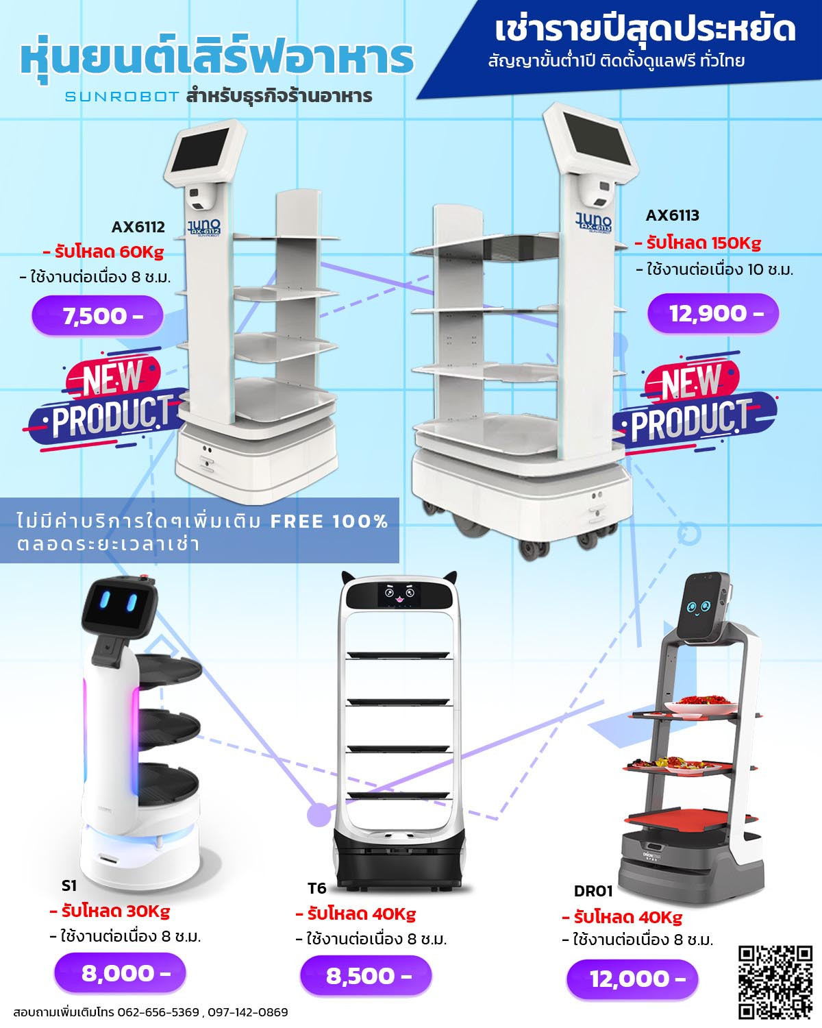 โดย SUN-ROBOT มีโปรโมชั่นการเช่าใช้รายปีแบบสุดประหยัดให้เลือกใช้หลากหลายรุ่น เริ่มต้นเพียง 7,500บาท/เดือน สัญญาขั้นต่ำเพียง1ปีเท่านั้น บริการติดตั้งดูแล Service ฟรีตลอดระยะสัญญาทั่วประเทศ มั่นใจในการให้บริการ