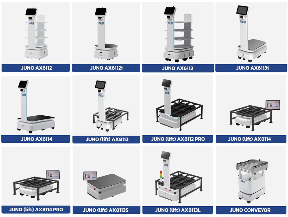 หุ่นยนต์ส่งของขนาดเล็กคุณภาพสูง Sunrobotics & ai ร่วมกับ Beijing Autoxing Technology นำหุ่นยนต์ส่งของขนาดเล็ก AX series ทั้ง12รุ่น เข้ามาจำหน่ายในประเทศไทยอย่างเป็นทางการ โดยเริ่มวางจำหน่ายในช่วงไตรมาสที่2ของปี 2024 เป็นต้นไป Juno Robot : AX Series ทั้ง12รุ่น ได้แก่